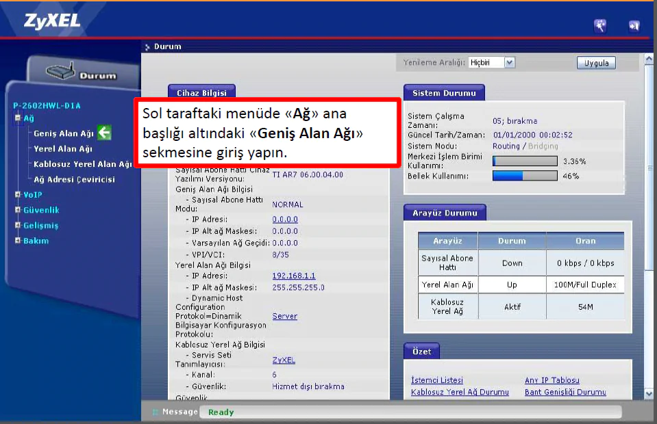 Sol taraftaki menü listesinde sırasıyla “Ağ” → “Geniş Alan Ağı” menülerine giriş yapın.