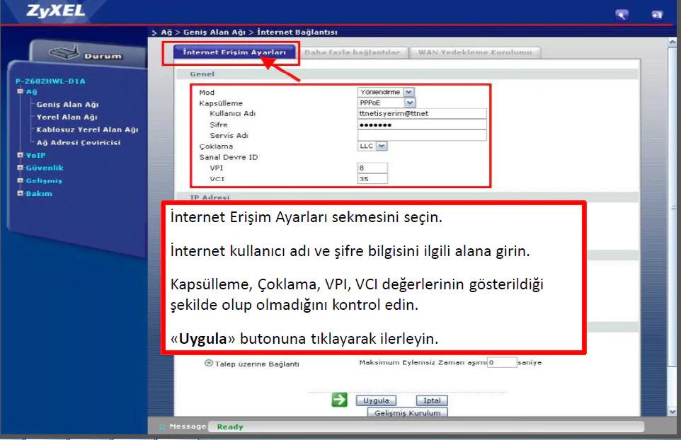 - Daha sonra açılan sayfada “Kullanıcı Adı” ve “Şifre” kutucuklarına, servis sağlayıcınızın (ISS) verdiği internet kullanıcı adı ve şifre bilgilerini girin. “Kapsülleme” kısmında “PPPoE” seçeneğini seçip “VPI” ve “VCI” değlerini sırasıyla “8” ve “35” olarak belirleyelim, “Çoklama” kısmında “LLC” seçeneğini seçtikten sonra “Uygula” butonuna tıklayarak ilerleyelim.