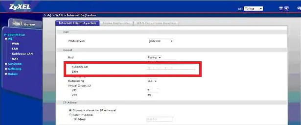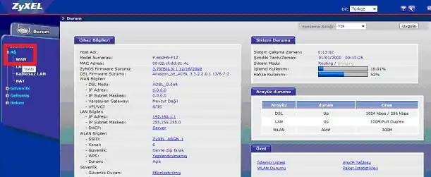 Karşımıza gelecek olan ekranda sol tarafta bulunan menü listesinden Ağ → WAN menülerine tıklıyoruz.