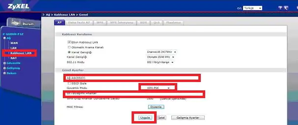 Ekranda bulunan Ağ Adı ( SSID ) kısmına Türkçe karakter kullanmadan bir kablosuz ağ ismi belirliyoruz. Güvenlik Modu kısmında WPA2–PSK seçeneğini seçip Ön Paylaşımlı Anahtar kısmına ise en az sekiz karakter olmak üzere ve Türkçe karakter kullanmadan bir kablosuz ağ şifresi belirleyip Uygula butonuna tıklıyoruz.